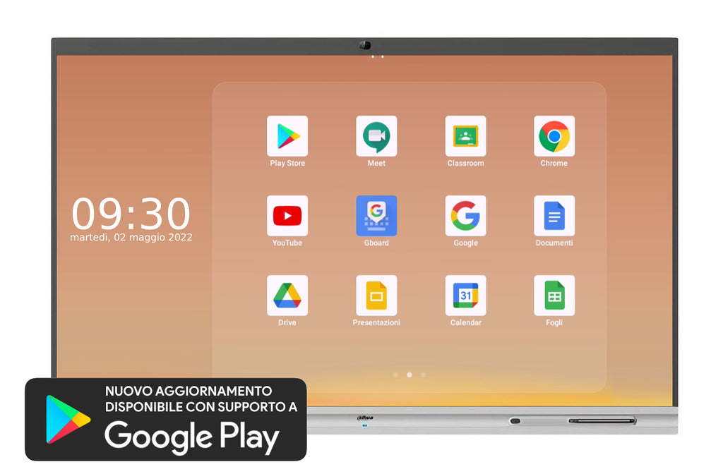 Grazie al nuovo aggiornamento, il monitor supporta Google Play Store e tutte le applicazioni della suite Google For Education (Drive, Classroom, Meet, GMail, Calendar, Fogli, Documenti, Presentazioni, Moduli).