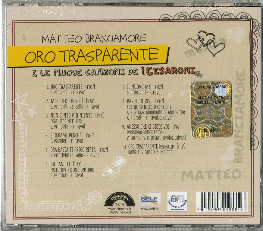 Il tuo cd di / your cd of : Branciamore Matteo - Oro Trasparente Cd 8004644005843 sarà spedito e consegnato in 24/48h in Italia 48/72 in Europa / will be shipped and delivered in 24 / 48h in Italy 48/72 in Europe