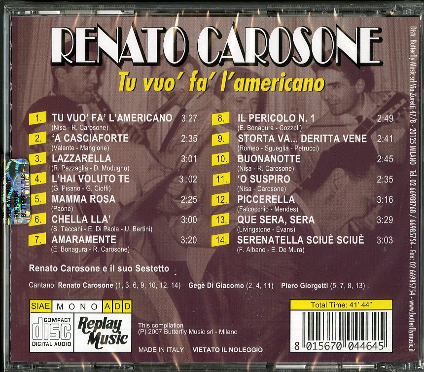 Il tuo cd di / your cd of : Carosone Renato - Tu Vuo Fa L'Americano Cd 8015670044645 sarà spedito e consegnato in 24/48h in Italia 48/72 in Europa / will be shipped and delivered in 24 / 48h in Italy 48/72 in Europe