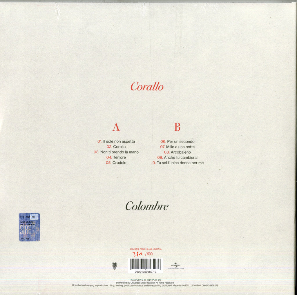 Il tuo Vinile LP di / Your Vinyl LP's :Colombre - Corallo (Vinile Rosso Numerato E Autografato Limited Edt.) Lp 0602435958279 sarà spedito e consegnato in 24/48h in Italia 48/72 in Europa / will be shipped and delivered in 24 / 48h in Italy 48/72 in Europe