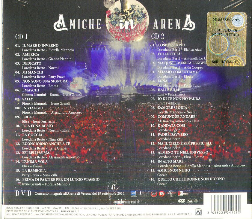 Il tuo cd di / your cd of : Compilation - Amiche In Arena (2Cd+Dvd+Digifile) Cd 8058333341392 sarà spedito e consegnato in 24/48h in Italia 48/72 in Europa / will be shipped and delivered in 24 / 48h in Italy 48/72 in Europe