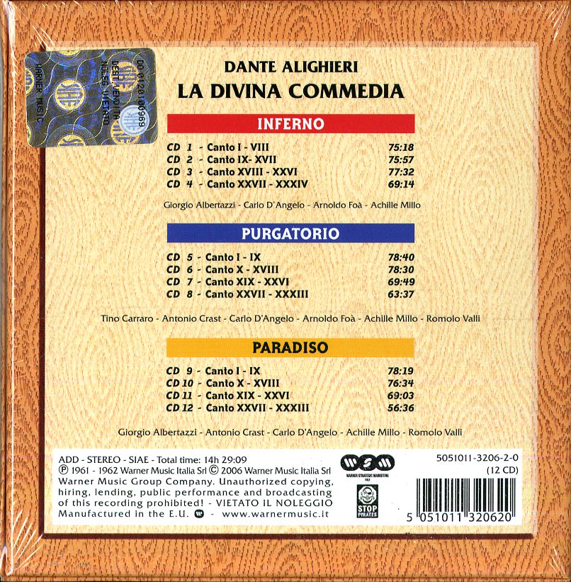 Il tuo cd di / your cd of : Compilation - La Divina Commedia (Box 12 Cd) Cd 5051011320620 sarà spedito e consegnato in 24/48h in Italia 48/72 in Europa / will be shipped and delivered in 24 / 48h in Italy 48/72 in Europe