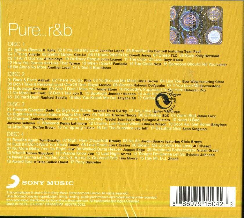 Il tuo cd di / your cd of : Compilation - Pure...R&B (Box4Cd) Cd 0886979150423 sarà spedito e consegnato in 24/48h in Italia 48/72 in Europa / will be shipped and delivered in 24 / 48h in Italy 48/72 in Europe