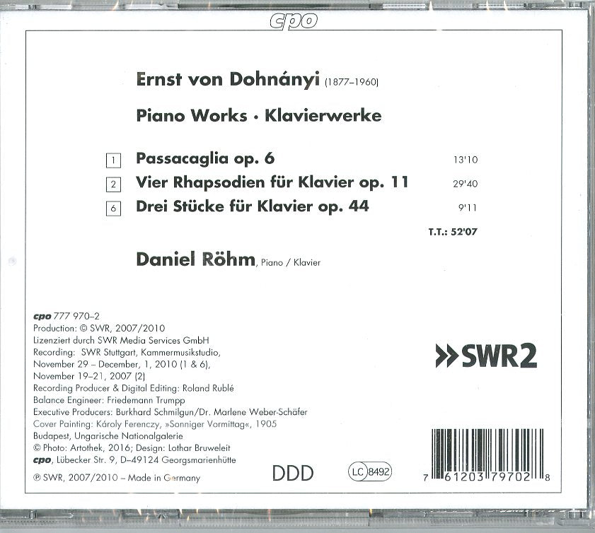 Il tuo cd di / your cd of : Daniel Rohm (Piano) - Dohnanyi: Opere Per Piano (Passacaglia Op.6,4 Rapsodie Op.11... Cd 0761203797028 sarà spedito e consegnato in 24/48h in Italia 48/72 in Europa / will be shipped and delivered in 24 / 48h in Italy 48/72 in Europe