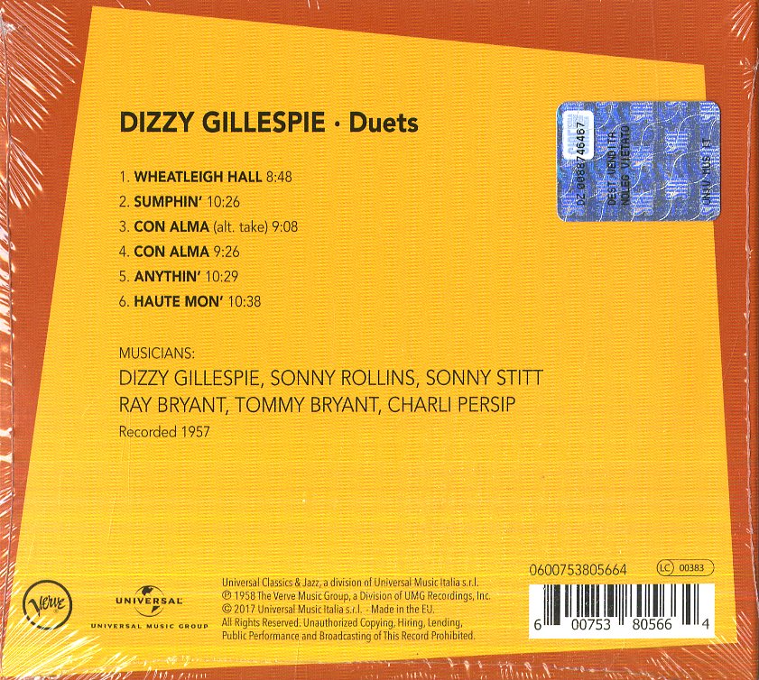 Il tuo cd di / your cd of : Gillespie Dizzy - Duets Cd 0600753805664 sarà spedito e consegnato in 24/48h in Italia 48/72 in Europa / will be shipped and delivered in 24 / 48h in Italy 48/72 in Europe