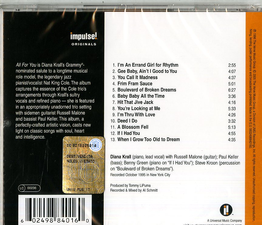 Il tuo cd di / your cd of : Krall Diana - All For You Cd 0602498840160 sarà spedito e consegnato in 24/48h in Italia 48/72 in Europa / will be shipped and delivered in 24 / 48h in Italy 48/72 in Europe