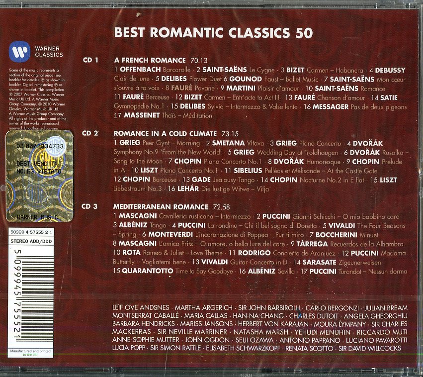 Il tuo cd di / your cd of : Leif Ove Andsnes, Argerich, Barbirolli, Pappano, Scotto, Pavarotti, Ozawa, Muti, - 50 Best Romantic Classics (Box3Cd)(Barcarolle,Chiaro Di Luna,Gymnopedie No.1.. Cd 5099945755521 sarà spedito e consegnato in 24/48h in Italia 48/72 in Europa / will be shipped and delivered in 24 / 48h in Italy 48/72 in Europe