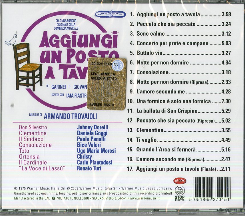 Il tuo cd di / your cd of : O. S. T. -Aggiungi Un Posto A Tavola - Aggiungi Un Posto A Tavola Cd 5051865370451 sarà spedito e consegnato in 24/48h in Italia 48/72 in Europa / will be shipped and delivered in 24 / 48h in Italy 48/72 in Europe