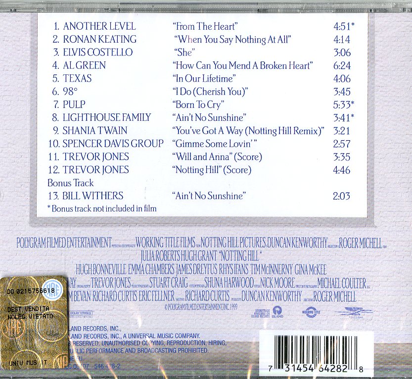 Il tuo cd di / your cd of : O.S.T.-Notting Hill - Notting Hill Cd 0731454642828 sarà spedito e consegnato in 24/48h in Italia 48/72 in Europa / will be shipped and delivered in 24 / 48h in Italy 48/72 in Europe