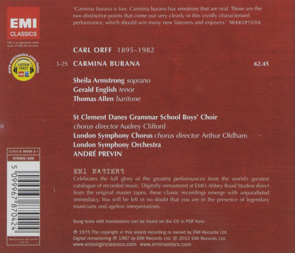 Il tuo cd di / your cd of : Previn Andrè( Direttore), Sheila Armstrong( Soprano), Gerald English( Tenore) - Carmina Burana Cd 5099967870424 sarà spedito e consegnato in 24/48h in Italia 48/72 in Europa / will be shipped and delivered in 24 / 48h in Italy 48/72 in Europe