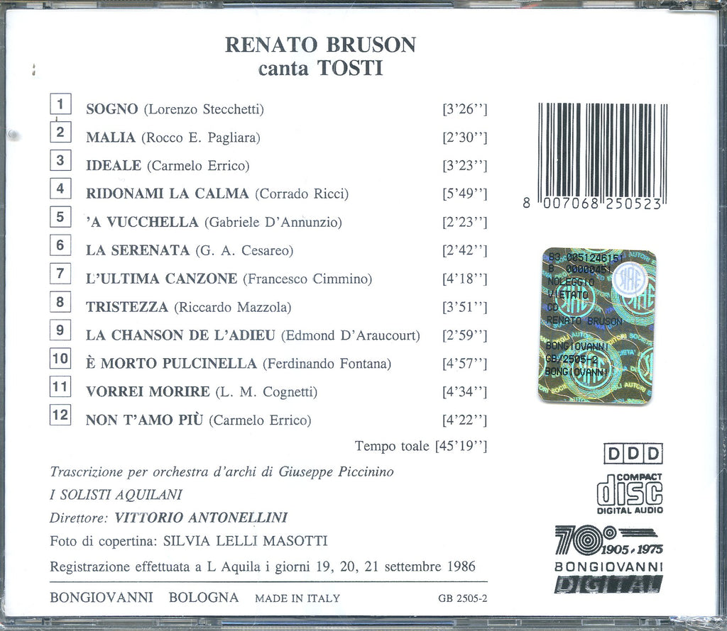 Il tuo cd di / your cd of : Renato Bruson (Baritono) - Renato Bruson Canta Tosti Cd 8007068250523 sarà spedito e consegnato in 24/48h in Italia 48/72 in Europa / will be shipped and delivered in 24 / 48h in Italy 48/72 in Europe