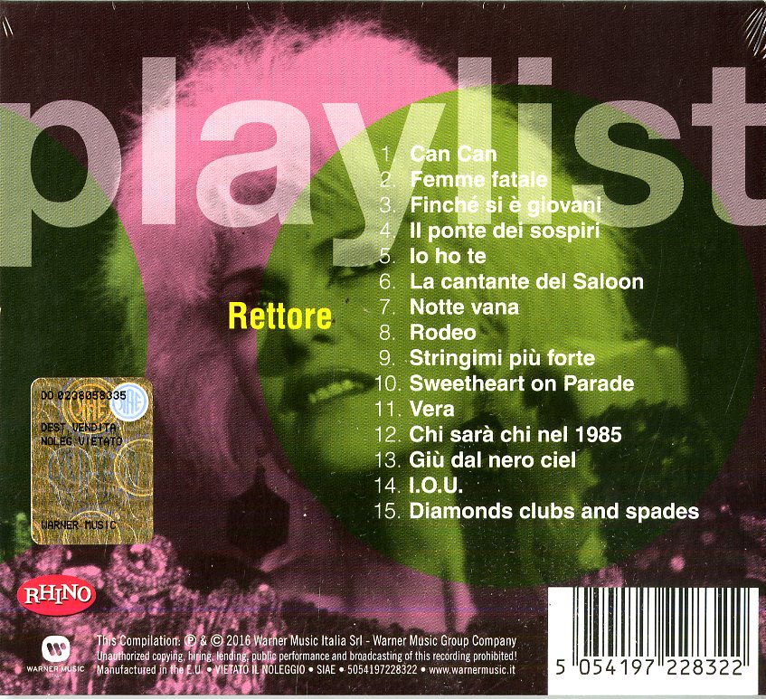 Il tuo cd di / your cd of : Rettore Donatella - Playlist: Donatella Rettore Cd 5054197228322 sarà spedito e consegnato in 24/48h in Italia 48/72 in Europa / will be shipped and delivered in 24 / 48h in Italy 48/72 in Europe