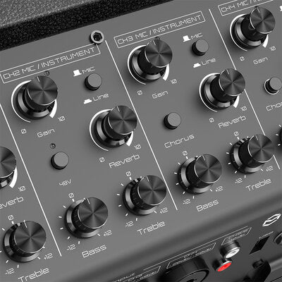 The Musiccube T3-II is a 150 W multifunctional and versatile PA system designed to deliver high performance in a compact and easy-to-carry format weighing just 9.8 kg. It features an 8" woofer and four 2" mid-tweeters: state-of-the-art speakers two of which (mid-tweeters) are strategically placed on the left and right flanks projecting sound over a 270° range. When laid out horizontally its 30° elevation angle ingeniously solves the feedback dilemma. The "panoramic sound" design therefore not only ensures frontal sound propagation but also provides a useful rear contribution for performers in the back for real-time feedback. The Musiccube T3-II features four independent input channels each with bass/treble adjustment and reverb adjustment knob. These inputs equipped with Combo connectors support microphones condenser microphones with phantom power (CH1 and CH2 only) guitars and other instruments. Channels 3 and 4 in addition to reverb offer chorus effects for electric guitars wind instruments and keyboards. It also has AUX RCA Bluetooth and USB inputs. Through its intuitive audio interface - a special digital cable that is included - this revolutionary PA speaker connects seamlessly to mobile devices either via a 3.5 mm mini-jack digital connector or via USB Type-C. It also allows online streaming and internal recording acting as a digital audio bridge for mobile devices. The T3-II is powered by two built-in 2550 mAh lithium batteries each which provide approximately 6 hours of battery life depending on use. The softbag is included in the price. This system is ideal for outdoor performances live shows and other applications that require powerful clear sound. User benefits 4 MIC / line / instrument inputs Portability thanks to its low weight USB interface Integrated professional sound card that supports a seamless connection to the main streaming transmission platforms Battery power supply for use even in places where there is no power supply Areas of use Indoor and outdoor mobile shows Audio streaming and recording Events where there is no power source available