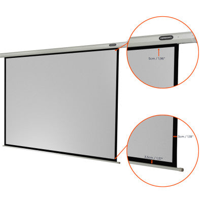celexon screen Electric Economy 160 x 120 cm The Electric Economy series from celexon is the cost efficient solution for a motorised screen and is excellent value for money. Features: - 154 x 116 cm viewing area (equates to a diagonal of 185 cm or 73 inches) - 3 cm black border (left/right) - 35 cm black border bottom - 5 cm black drop (top) - Dimensions of housing (W x H x D): 184 x 10 x 8 cm - Weight: 12 kg - Power: 40W voltage: 230 V frequency: 50 Hz - Ideal for home cinema and business applications with a gain factor of 1.2 - Adjustable for different aspect ratios - Inflammability rating B1 DIN 4102-1 - Extremely low-noise motor with stabiliser shaft - Suitable for wall or ceiling mounting - Elegant white casing - Available with control box (wall mounted) and remote control The Electric economy screen is a fully equipped motorised projector screen selling at an attractive price. The screen can be operated comfortably by using the remote control or from a wall-mounted control box. The gain factor of the screen is 1.2. The fabric is suitable for both LCD and DLP projectors and allows a wide viewing angle. The black rear avoids loss of light and adds definition to the projected images. The black border surround improves the contrast and clarity of the picture. Included in the delivery are the wall-mounted control box a remote control device (plus batteries) the fixings for the wall or ceiling mount and a user guide.