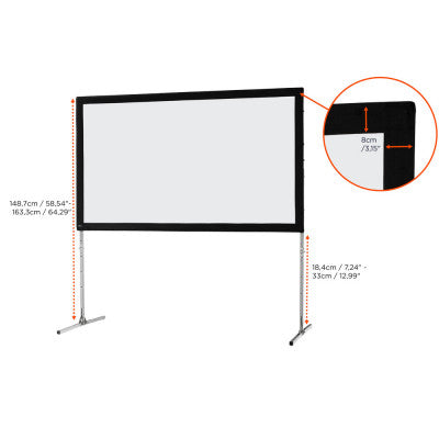 celexon Folding Frame screen 203 x 114 cm Mobile Expert front projection celexon's Folding Frame screen Mobile Expert series is a very high quality extremely robust screen designed for multiple mobile applications. Quick and easy set up and comes with a rugged flightcase. Features : - 203 x 114 cm viewing area format: 16:9 - Max height : 163 cm min height: 148 cm - Flightcase dimensions ( W x D x H): 89.5 x 31 x 33 cm - Total weight (including flight case): 23.2 kg - Front projection fabric with a black border and black back and round fastening poppers - One-piece aluminum folding frame two-piece aluminum feet - Quick and easy assembly without the use of tools - Extremely stable and resistant - Light weight due to aluminum construction - Rugged flightcase with rotating metal clasps and wheels - Storage bag for the screen fabric The celexon Folding Frame Mobile Expert screen can be set up in minutes without using tools. The screen is fastened by poppers onto the front of the aluminum frame. The feet can be mounted at different heights and provide a stable stand. A flightcase protects the screen during transport and during stroage. Ideal for rental large events clubs schools etc.