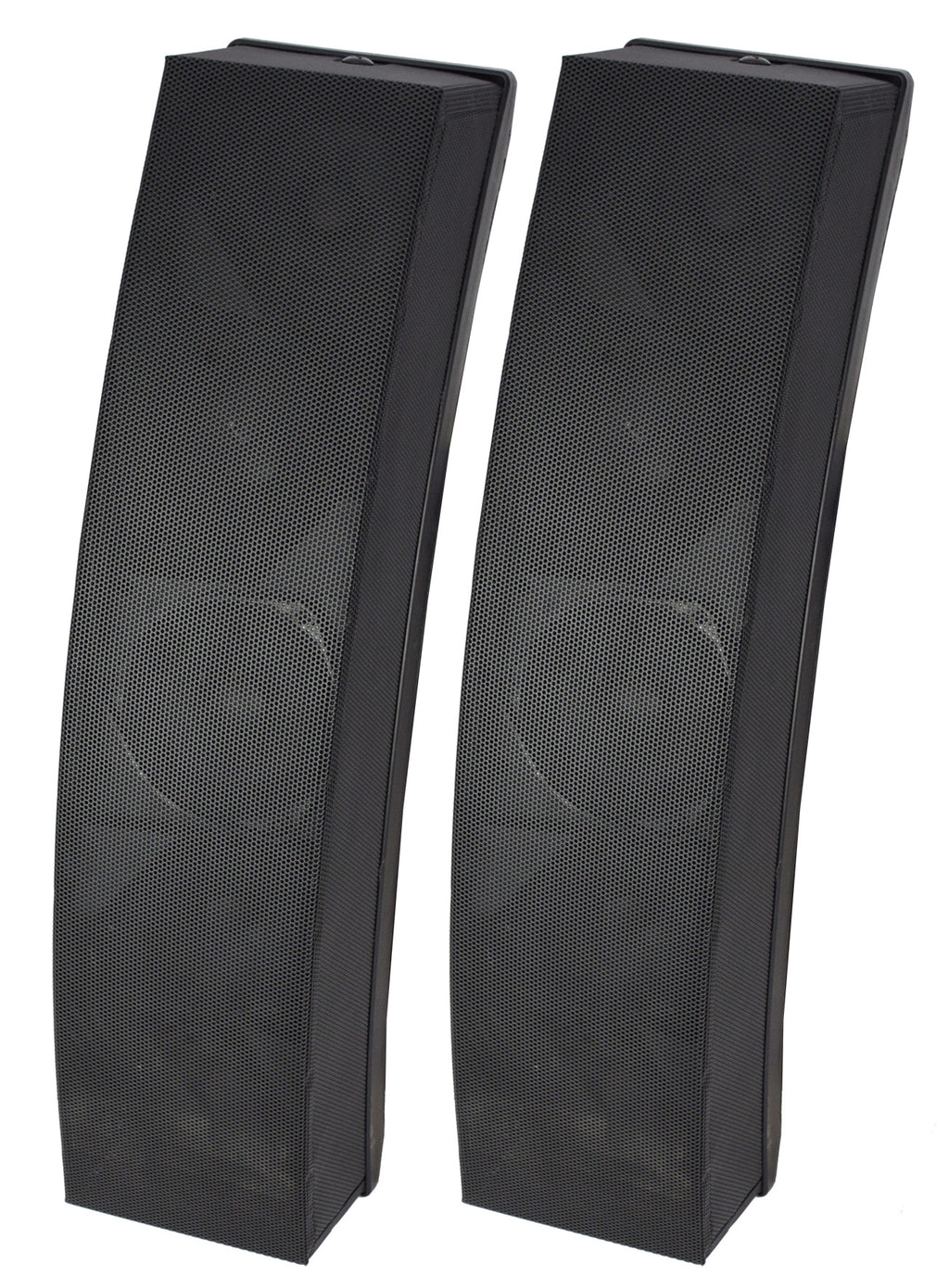 Due diffusori a colonna, ognuno contenente 5 speaker da 5' disposti in posizione disassata per la massima copertura sonora in ampio raggio. Realizzata in ABS con griglia metallica, è di colore nero. Si montano verticalmente e presentano, sul retro, connettori sia a morsetto che di tipo speakon (in entrata e in uscita per il collagamento a cascata di altri diffusori). Operano a impedenza 8 Ohm e sono adatti ad ogni tipo di impiego.