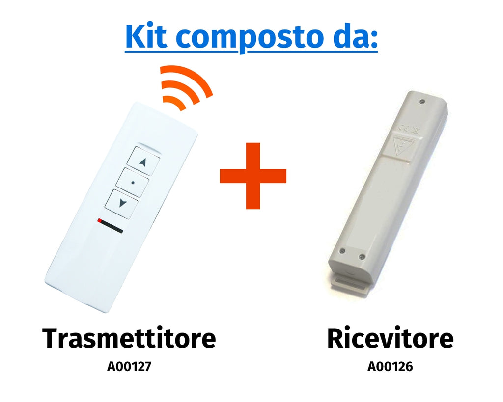 Con questo kit per il comando radio è possibile gestire a distanza qualsiasi dispositivo con motore elettrico compatibile tra cui schermi motorizzati, elevatori elettrici, ecc. Sono inclusi la centrale radio (codice A00126) e il trasmettitore ad 1 canale e 3 pulsanti (codice A00127). Ha un raggio operativo di circa 60 metri a campo libero e questo consente di usarlo sia in contesti domestici, che uffici o sale meeting anche di dimensioni medio/grandi. I 3 pulsanti dedicati permettono di selezionare la singola funzione per un controllo totale. Il ricevitore funziona anche tramite contatti puliti come ad esempio un interruttore opzionale da abbinare a comando RF. L'installazione è semplice e veloce, all'interno sono presenti le istruzioni di montaggio e programmazione in italiano. I componenti sono caratterizzati dal design elegante e moderno, dall'ottima qualità costruttiva e dall'elevata affidabilità. Il trasmettitore è dotato di un supporto da parete in elegante plexiglass trasparente con magneti integrati. E' molto richiesto sia in ambito professionale che residenziale in quanto offre comodità e praticità per il controllo a distanza del dispositivo.