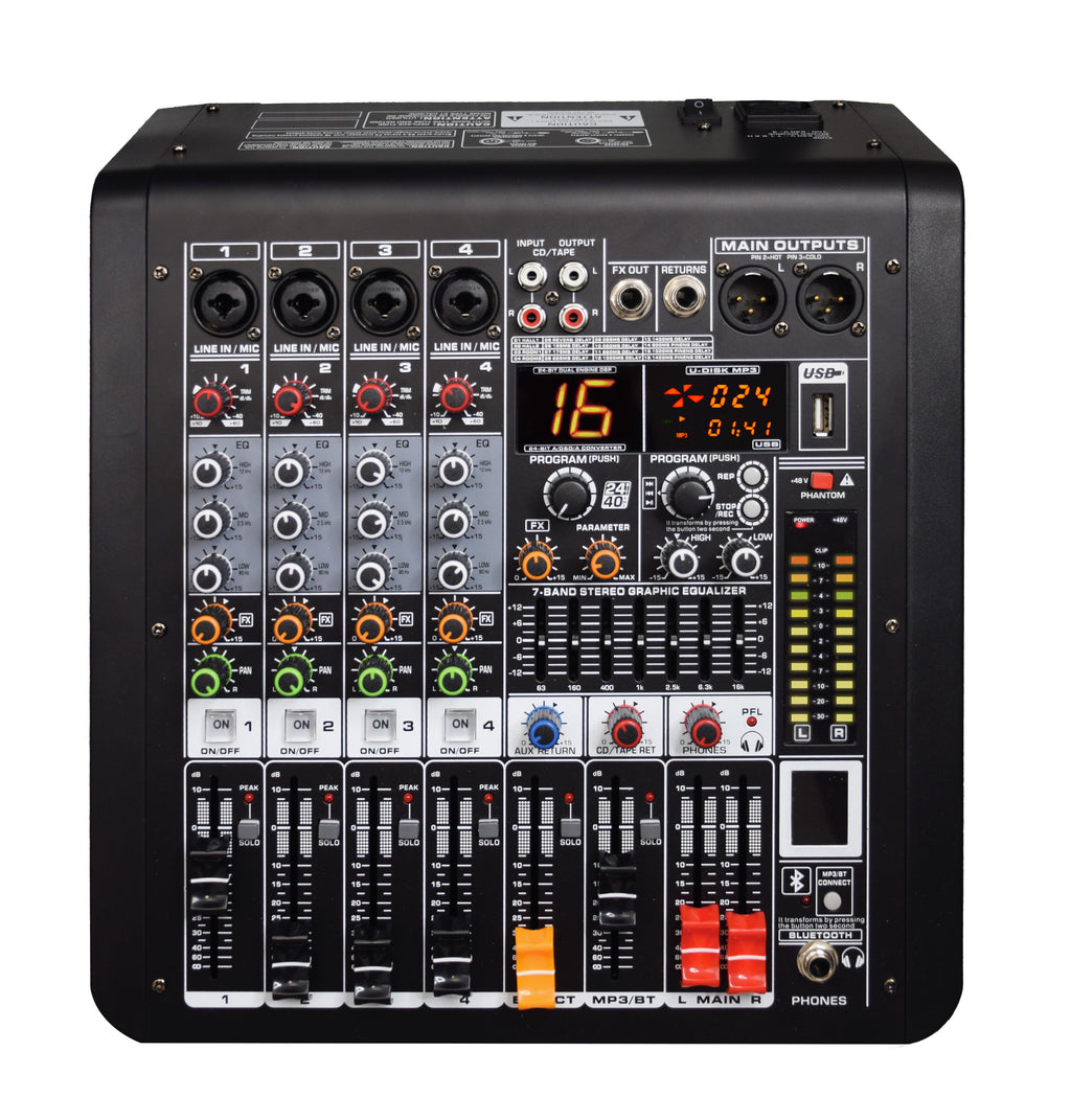 Destinato ad uso professionale, racchiude funzioni esclusive quali DSP 16 effetti a 24bit, alimentazione phantom +48V, advanced Vu meters e lettore Mp3 con display grafico. Possiede 4 ingressi LINE/MIC con ingresso bipasso XLR/6,3mm ed 1 ingresso LINE RCA. Ogni canale dispone di regolazione indipendente di guadagno, regolazione toni alti, medi e bassi, gestione degli effetti e slider di volume con tasto di preascolto in cuffia. E' possibile attivare il modulo bluetooth di ultima generazione per la ricezione di audio da smartphone o tablet. E' in grado di registrare direttamente su supporti USB e dispone di un equalizzatore grafico a 7 bande.