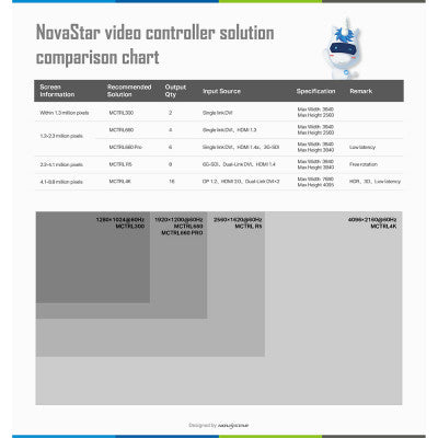 Customize extra-large screen resolution with the MCTRL660 PRO controller by NovaStar. It is developed to configure screens with ultra-width or ultra-height and a single MCTRL660 PRO has a loading capacity of up to 1920×1200 @ 60 Hz. The MCTRL660 PRO has various video connectors: Input connectors: 1 × 3G-SDI 1 × HDMI 1.4a 1 × single-link DVI. Output connectors: 6 × Gigabit Ethernet port 2 × 10G optical port. Loop output connectors: 1 × 3G-SDI LOOP 1 × HDMI LOOP 1 × DVI LOOP. The MCTRL660 PRO has many industry-leading advanced technologies: • Input of ultra-high color depths such as 10-bit/12-bit 4:4:4 with input resolutions up to 1920×1080 @ 60 Hz increasing color expression capabilities by 4096 times compared to 8-bit inputs • Independent Gamma adjustment of RGB effectively controlling image nonuniformity under low grayscale and white balance offset to improve image quality • A low latency of less than 1 frame • Dual working modes: working as sending card and fiber converter • One-click backup and recovery quickly recovering previous screen configurations to deal with sudden on-site failure. • Image mirroring • Auto LED screen configuration • Web control • Pixel level brightness and chroma calibration • Monitoring of inputs • Multiple MCTRL660 PRO units can be cascaded.