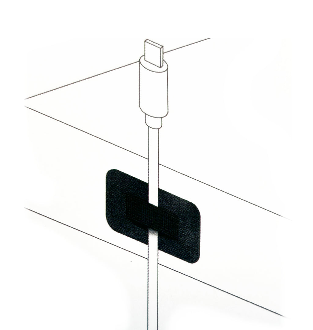 Piccola plachetta in pelle con materiale biadesivo per il fissaggio a qualunque superficie. La parte centrale presenta una banda in materiale elastico adatta a trattenere piccoli cavi.