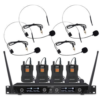 - - - - - - - - - - Set of four UHF wireless (4 bodypack) professional quality microphones, 4 channels receiver included. Ideal for professional vocal or audio applications, speech, animation, etc.
