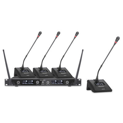 The BE-10CONF Conference System is perfectly suited to small installations to offer a communication solution for boards of directors, city councils, general assemblies. The receiver connected to a PM 8P preamplifier gives the possibility to set the priorities for the microphone lecterns, and therefore to obtain a "Chairman" and "Delegates" lectern as in a classic conference system. 506.0 / 517.5 / 531.0 / 546.5 MHz frequencies.Main features4-channel UHF receiver equipped with selectable PLL synthesized receiver modulesAutomatic reception systemAnti-interference system for simultaneous operation of multiple unitsRange: 50 mTransmitter power: 10 mWFunction display on LCD screen Infrared "sync" function to transmit the frequency to the transmittersIdeal for professional vocal or audio applications, speech, animation, etc.Supplied with: 1 jack cable (mix output) and 2 XLR cablesIntegrated brackets
