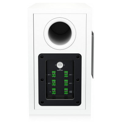 Subwoofer bass-reflex da 80 W passivo progettato per il collegamento in parallelo in un sistema PA a 100 V. Colore bianco. Viene utilizzato per rinforzare le basse frequenze durante la riproduzione di musica di sottofondo e nei suoni di animazione. L'altoparlante utilizzato è un woofer da 20 cm con membrana in fibra di carbonio. Il cabinet è realizzato in MDF con 8 inserti e viti utilizzabili con il set di staffe in dotazione per il fissaggio a qualsiasi superficie piana. Il collegamento avviene su una morsettiera Euroblock di ingresso/uscita e la regolazione della potenza avviene tramite un selettore rotativo posto sul pannello frontale. Le potenze selezionabili sulla linea a 100 V sono 80 / 40 / 20 / 10 W.