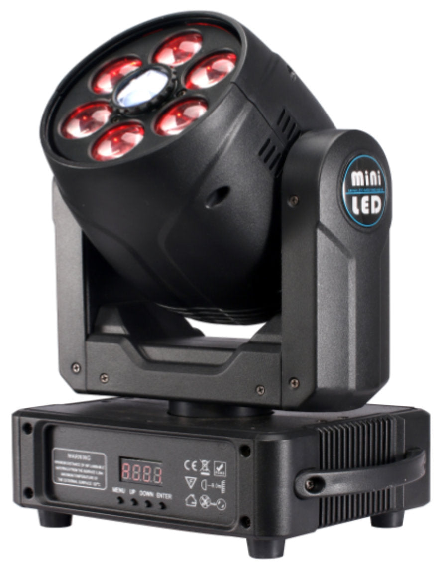 Straordinaria testa mobile composta da un proiettore centrale (30W) con ruota colori + ruota gobo e da 6 lenti esterne in grado di proiettare faci di luce in ogni colore grazie ai 6 potenti led RGBW da 10W. Il faro centrale riproduce in gobo triplicato mentre le sei lenti proiettano altrettanti fasci di luce concentrati con zoom variabile. Entrambi gli effetti ruotano in senso orario o antiorario grazie al motore interno. Infinite combinazioni permettono di avere sempre effetti differenti. Opera sia in automatico che a tempo di musica ma può essere pilotato da centraline DMX per impieghi professionali. Staffa di fissaggio in dotazione.